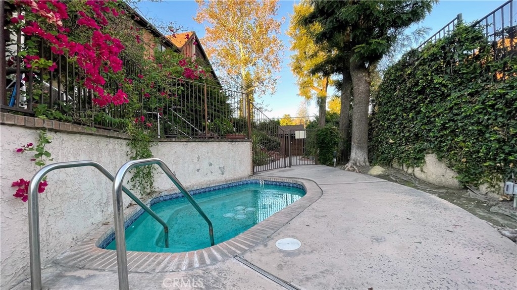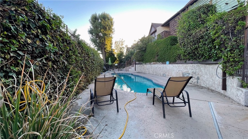 The private gated entry to this complex leads you through meandering walkways to the inviting gated pool area where summer welcomes you to take a refreshing dip. Beyond the pool area, the steps will guide you up to Unit, featuring an open wood deck/patio area where you can enjoy sitting on a couple of comfy patio chairs and relax after a long day. Upon entering the tri-level interior, a wholesome fireplace with a raised hearth awaits, providing a cozy gathering spot on cool fall evenings. Adjacent to the formal living room and formal dining room is a stand-alone wet bar, perfect for entertaining guests. The kitchen has been updated with lighter neutral "euro-style" cabinets, a custom tile backsplash, a garden window, and a small eat-in nook. Additionally, there's a balcony where your BBQ unit can be installed for easy outdoor cooking. The master bedroom boasts a walk-in closet, and fresh paint, along with another private balcony. The secondary bedroom is spacious, featuring fresh paint, and a private patio. Other features include a washer & dryer inside the unit, a GIANT BONUS room with a closet downstairs, and a two-car garage with direct access.