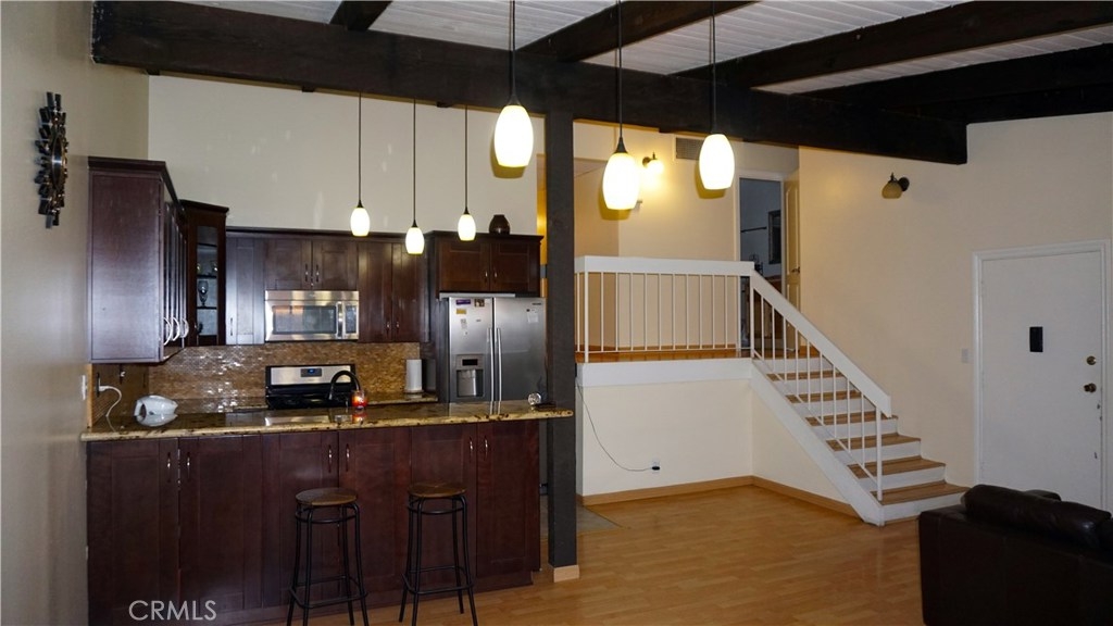 This 2 bedroom 2 bath split level condo offers a spacious open floor plan. The kitchen has been nicely updated with new walnut cabinets, granite counter tops and stainless Whirlpool steel appliances. The living room which is very spacious with vaulted wood beamed ceilings opens up to an elevated outdoor patio space. Absolutely perfects for the couple that likes to entertain. The unit boast pecan laminate floors in main living areas and tile floors in the kitchen and bathrooms. Both bathrooms are nicely updated with newer vanities and shower enclosures. Unit also has newer HVAC system. The unit offers two parking spaces, 2 storage spaces, onsite laundry facility and a picnic area perfect for family events. Hurry this one won't last! Call today to schedule a showing.