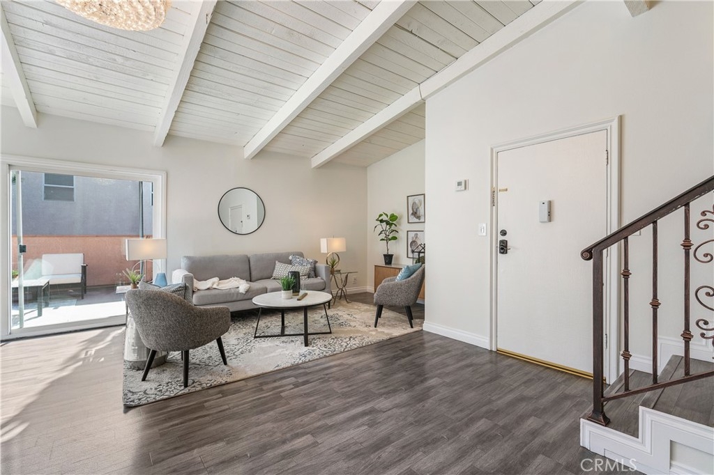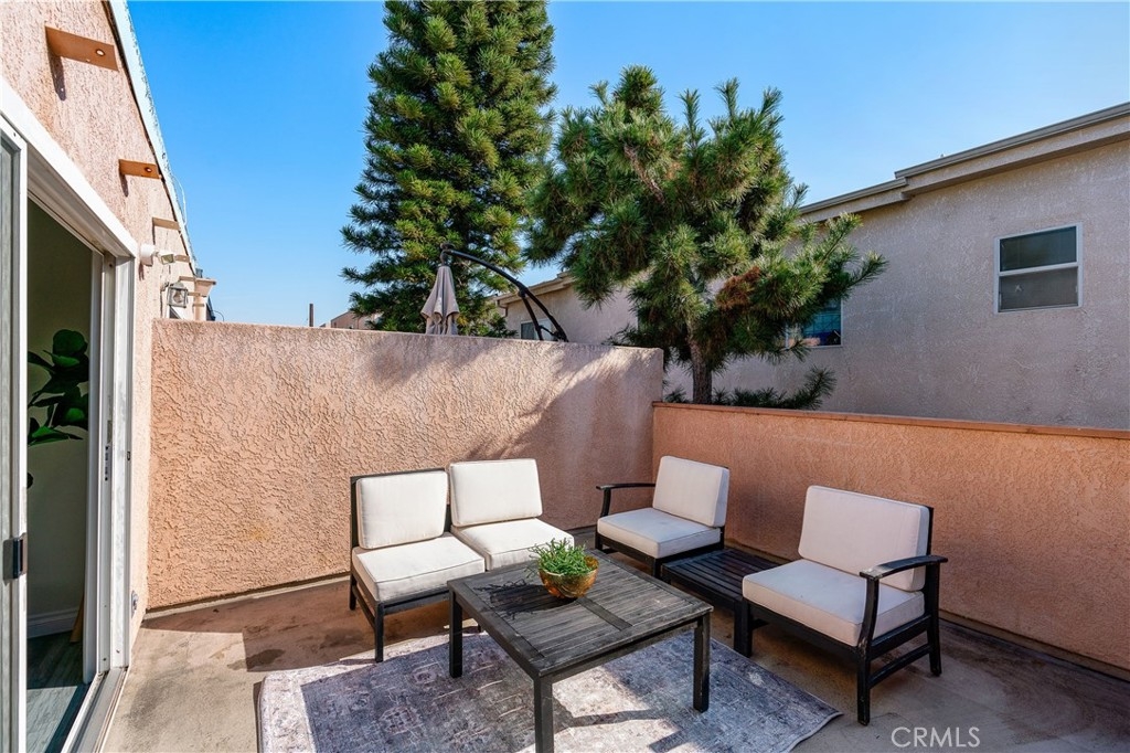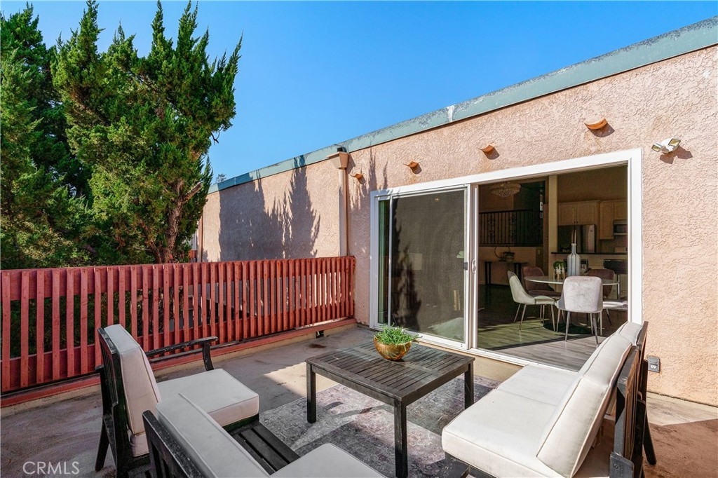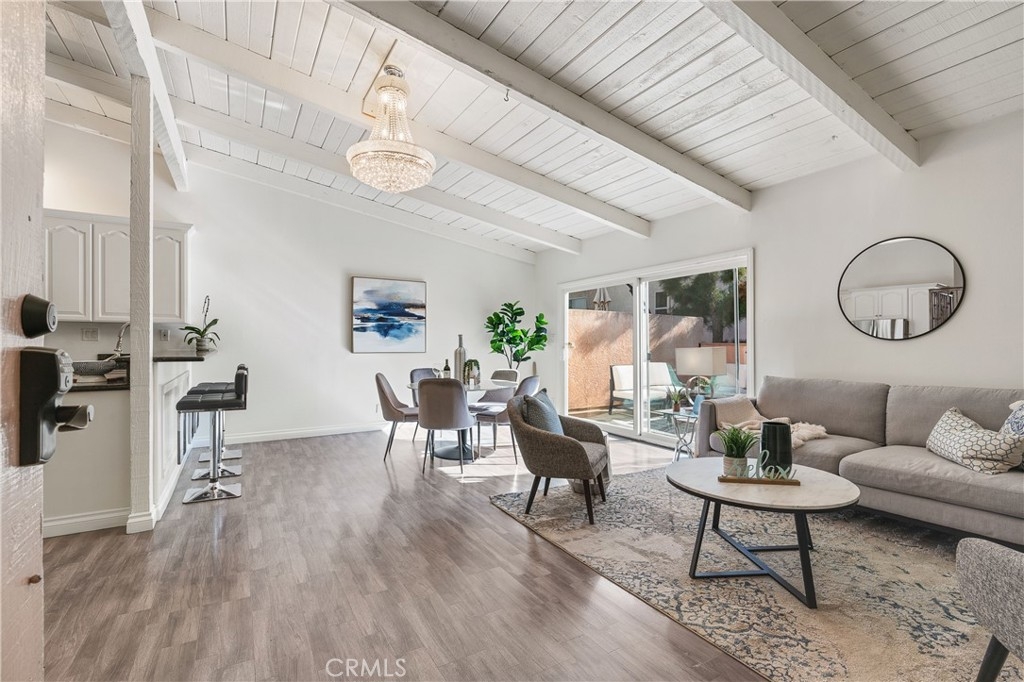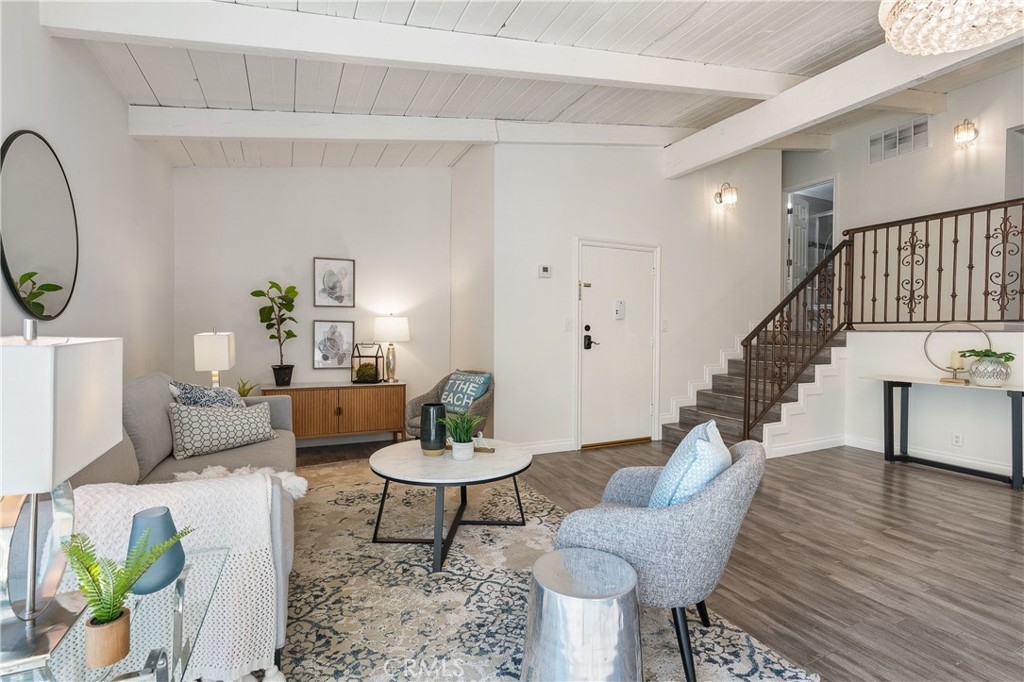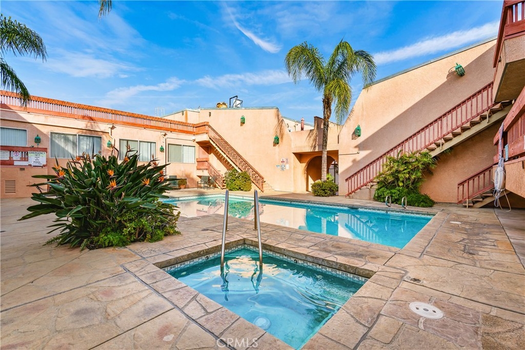 This beautifully designed, open-concept top-level condominium offers an abundance of space and natural light. Nestled within a well-kept gated community, this Resort Style complex boasts a spacious living area with soaring beamed ceilings, creating an airy and inviting atmosphere. The seamless flow into the dining area is perfect for entertaining, while sliding doors open to a large private patio—ideal for relaxing and sipping a delicious beverage or hosting a casual dinner with loved ones. The kitchen is equipped with granite countertops, ample cabinetry, and stainless-steel appliances, providing both style and functionality. Upstairs, you’ll find two generously sized bedrooms, primary with high ceilings and plenty of closet space for added convenience. The complex offers controlled access, a pool and spa, lush landscaping, and a recreation room for residents to utilize for parties and events. HOA covers common areas maintenance, water, sewer, trash, and gas!! Two assigned parking spots and additional storage space enhance the convenience and comfort of living here. Centrally located with easy access to major freeways, shopping centers, restaurants, bus lines, and Kaiser Permanente hospitals, this condominium is an ideal choice for those seeking a resort-style lifestyle in a prime location.