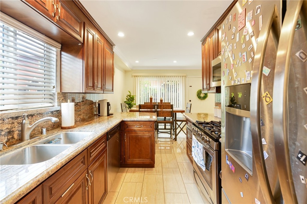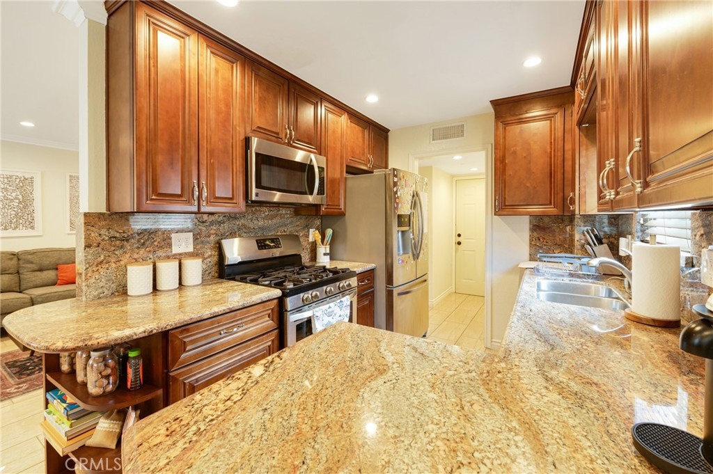 Wonderful opportunity to own this spacious 1,450 sqft charming 3 bedroom 2.50 bathroom townhouse. Private patio at the entrance. Nice sized living room/dining area with fireplace and recess lighting. Remodeled kitchen with granite counters and stainless steel appliances. 3 bedrooms 2 bathrooms on the second floor. Updated laminate and tile flooring. Guest bath on the first floor. Central A/C. 2 car garage. Laundry inside the unit. No expense was spared. Move in to this wonderful complex offering Association pool.