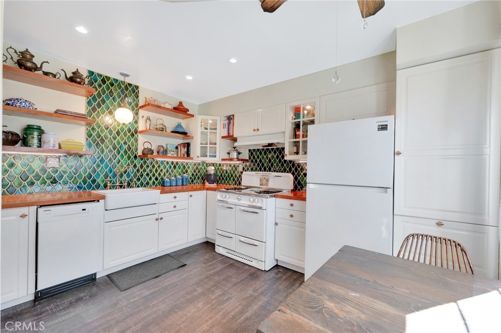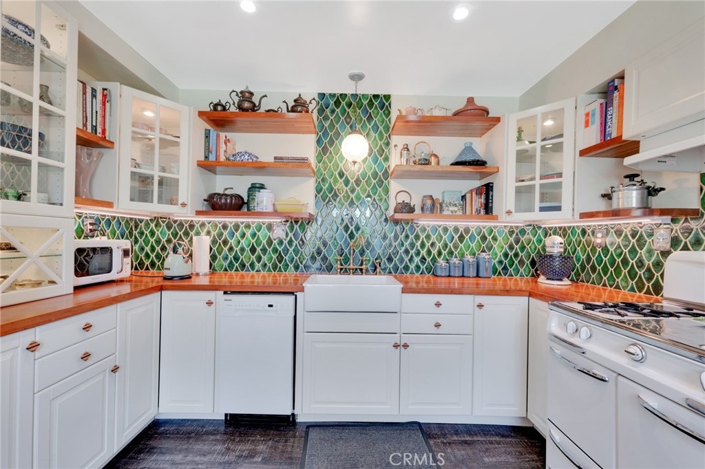 Beautifully upgraded two bedroom townhome with attached two car garage and no neighbors above or below! This wonderful, move-in ready home boasts high ceilings, an array of alluring updates, custom finishes, and a spacious tri-level design. The attention to detail is evident throughout! As you step inside, you'll immediately notice the abundant natural light, newer widows, and gorgeous custom fixtures. The entire home has been thoughtfully and well updated. The kitchen is a culinary enthusiast's dream with an antique Wedgewood stove, two Lazy Susans, ample storage, compact dishwasher, and farmhouse sink. Handmade tile imported from Poland and cherry butcher block countertops + floating shelves create a warm and inviting atmosphere perfectly complemented by newer cabinets and custom hardware. The floors have been upgraded with rich and luxurious vinyl planks throughout, providing a stunning aesthetic and a durable surface that is both easy to maintain and visually appealing. Both bedrooms are well sized with double closets and the master has a wonderful attached balcony perfect for an early morning cup of coffee or unwinding with a good book in the evening. The living room is huge! The fabulous built-in bookcase provides additional storage bringing both functionality and style to the living area, allowing you to showcase your favorite decorative pieces. Cozy up in front of the gas fireplace or relax by the wet bar (both hot and cold water at sink) while hosting family and friends. Both bathrooms have been tastefully updated as well with new vanities, sinks, hardware and even a stunning claw foot tub! Other features include: newer HVAC system, water heater, and laundry - washer/dryer included! Ideally located in a gated community with quick freeway access and within walking distance of dining, shopping and public transportation. HOA covers water, trash, insurance, maintenance, and a sparkling pool and spa!