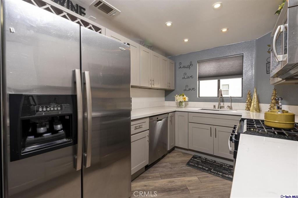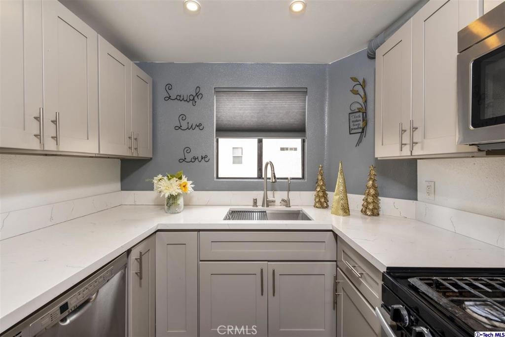Ready to move in 3-bedroom/2 bathroom tri-level condo in Panorama City. Property features a 2-car attached garage on the bottom level. This home has been recently renovated to create a warm and functional place to call home. You are immediately welcomed into the first level with a spacious living room, brand new floors and gas fireplace. Secondary level offers a large dining room with a bar, recessed lighting and a remodeled kitchen. Kitchen features brand new quartz countertops, updated cabinets, hardware, sink, faucet and stainless steel appliances. Also located on the second level, is a guest bedroom with a private entrance to the hall bathroom. Going up the stairs you will find a laundry closet for your washer and dryer and cabinets to store laundry supplies. On the third level, you will find a large bedroom with a vaulted ceiling and a walk in closet. Next to the walk-in closet is a full bathroom and a very good size bedroom. Community offers a sparkling swimming pool and spa.