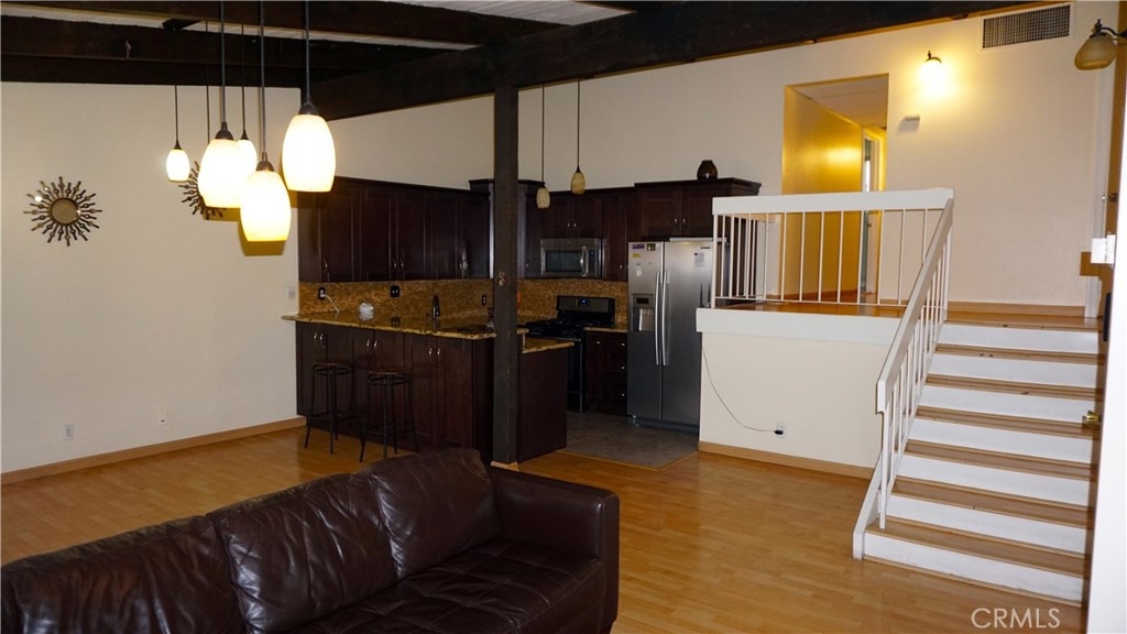 This 2 bedroom 2 bath split level condo offers a spacious open floor plan. The kitchen has been nicely updated with new walnut cabinets, granite counter tops and stainless Whirlpool steel appliances. The living room which is very spacious with vaulted wood beamed ceilings opens up to an elevated outdoor patio space. Absolutely perfects for the couple that likes to entertain. The unit boast pecan laminate floors in main living areas and tile floors in the kitchen and bathrooms. Both bathrooms are nicely updated with newer vanities and shower enclosures. Unit also has newer HVAC system. The unit offers two parking spaces, 2 storage spaces, onsite laundry facility and a picnic area perfect for family events. Hurry this one won't last! Call today to schedule a showing.